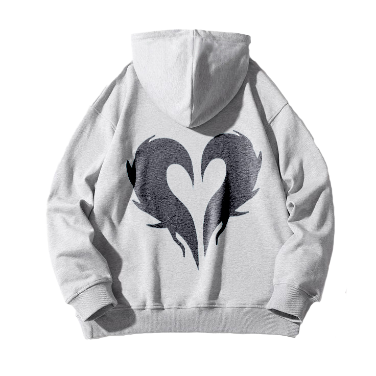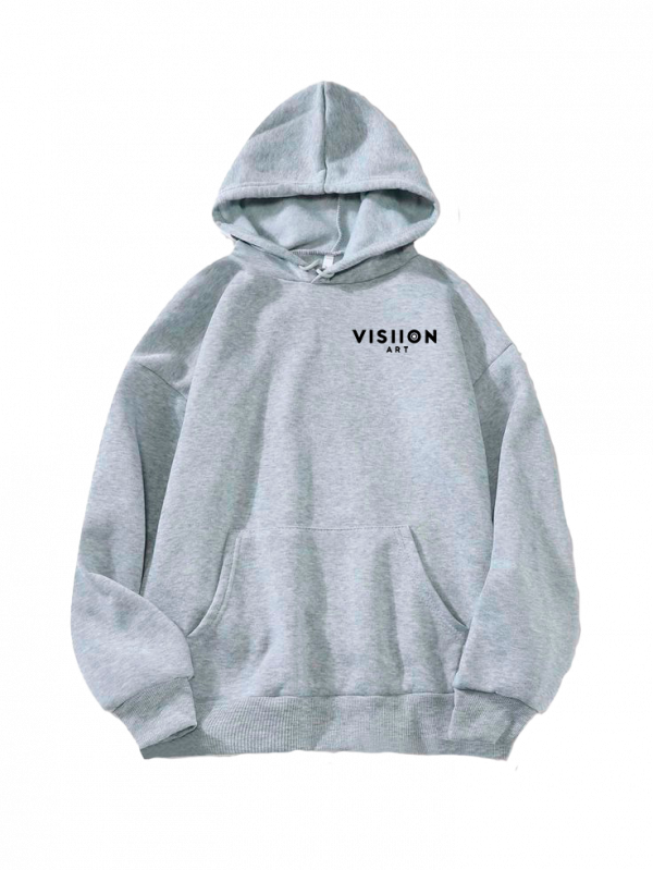 una sudadera con capucha de color gris claro, adornada con un diseño gráfico en el centro.