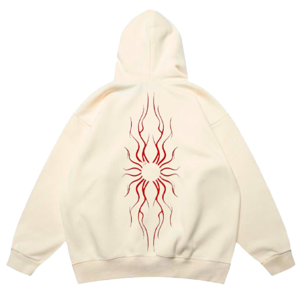 Sudadera beig con espiral roja en la parte trasera.