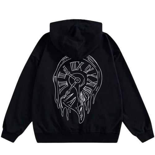 Destaca con esta sudadera negra de algodón, adornada con un diseño surrealista de reloj derretido en la espalda, perfecta para un look original y moderno.
